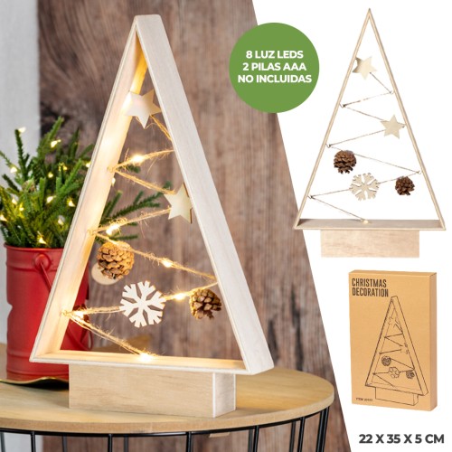 Moderno y elegante árbol de navidad fabricado en madera natural. Un original complemento decorativo que incluye adornos en materiales naturales, todos ellos iluminados por un trenzado de leds, ideal para crear un ámbiente acogedor. Con sencillo manual en Español e Ingles.Elaborado con elementos vegetales para así fomentar la utilización de materias primas naturales y reducir las emisiones contaminantes.8 LEDs. Alimentación a pilas (2xAAA no incluidas). 8 Ledes. 2 Pilas AAA No Incluidas