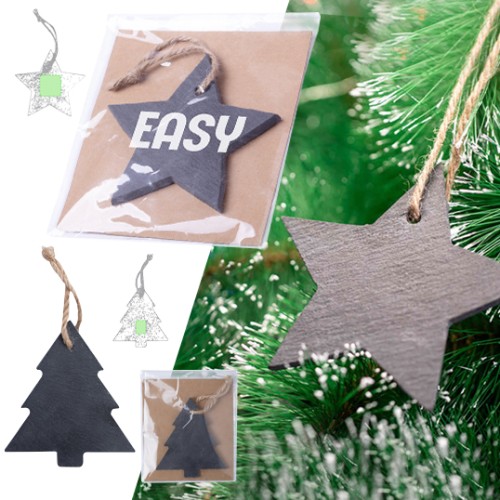 Adorno navideño en pizarra, con lacito para colgar y en elegantes diseños árbol de navidad y estrella.