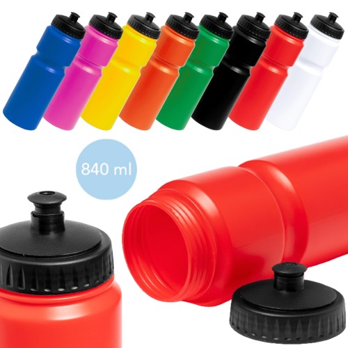 Bidón de 840 ml fabricado en resistente PET, con un diseño ergonómico que se adapta cómodamente a la mano. Cuenta con un tapón a rosca que incluye un dosificador, asegurando un sellado perfecto. Disponible en una variada gama de colores y presentado de manera individual en bolsa de papel. 840 ml