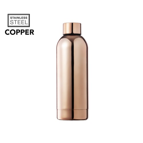 Bidón de 750 ml de capacidad, fabricado en acero inox y con recubrimiento exterior de cobre galvanizado. Tapón a rosca, libre de BPA. Presentado en caja individual negra de elegante diseño. 750 ml