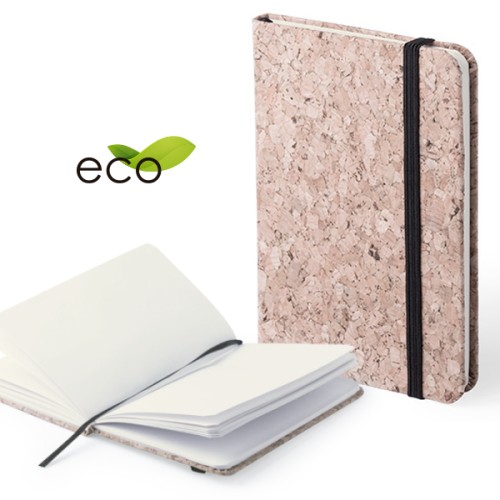 Bloc de notas con tapas de suave tacto acabadas en corcho natural. De 80 hojas lisas, con elástico de sujeción y marcapáginas de tela a juego. Portada Rígida. 80 Hojas