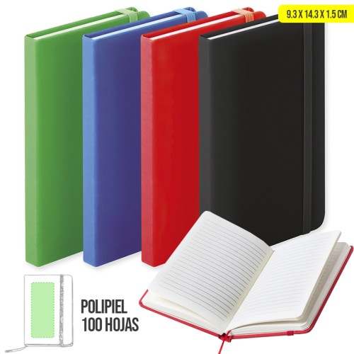 Bloc de notas con tapas de suave tacto, acabado en polipiel y en desenfadados colores. Con 100 hojas de distribución a una raya, elástico de sujeción y marcapáginas de tela a juego. Portada Rígida. 100 Hojas