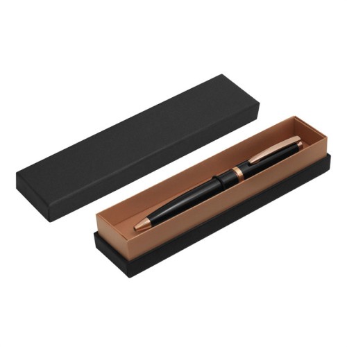 Metálico. Cuerpo color negro laqueado. Puntera, clip y anillo metálico en rose gold. Apertura giratoria. En la parte superior destape electroplateado rose gold. Tinta azul. Presentación en caja de regalo color negra, con detalle rose gold metalizado en su interior.
