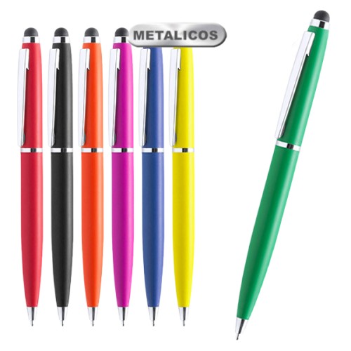 Bolígrafo puntero de mecanismo giratorio con cuerpo metálico de suave acabado en alegres colores. Accesorios y anillas en color plateado. Tinta azul.