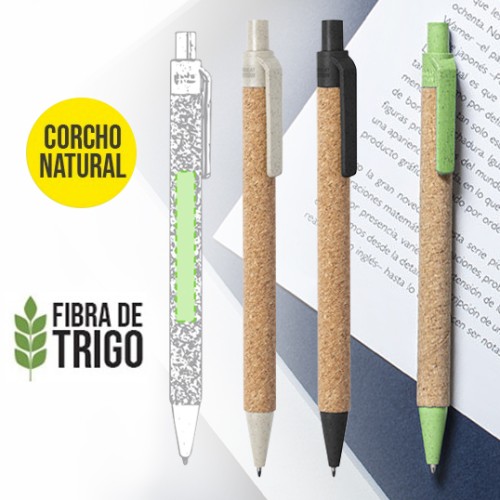 Bolígrafo de línea nature con mecanismo pulsador. Combinación de cuerpo en corcho natural y accesorios en caña de trigo y ABS , para así fomentar la utilización y reciclado de materias primas, reduciendo así las emisiones contaminantes. Disponible en variada gama de colores, con tinta azul. Distintivo Wheat Straw en la parte superior del bolígrafo.