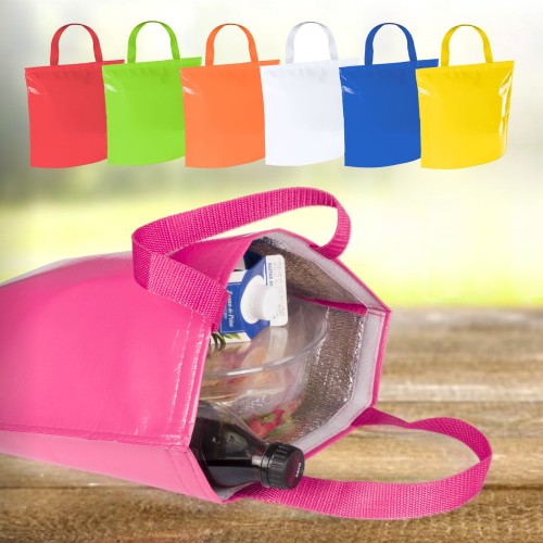 Bolsa nevera en resistente non-woven de acabado laminado brillante y cierre de velcro. Con cómodas asas de transporte en nylon a juego e interior isotermo en acabado de aluminio. Resistencia hasta 7kg de peso.