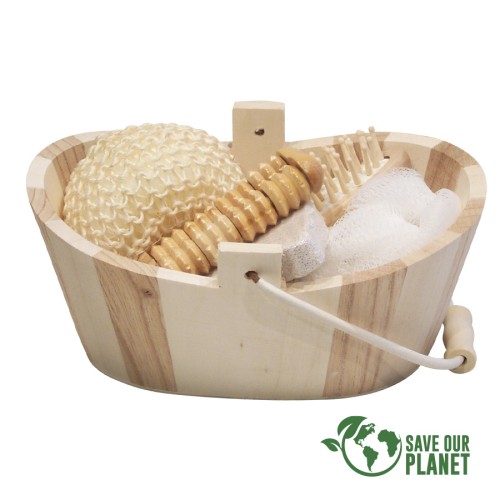 Canasto SPA de belleza en madera modelo "Naturals". Contiene cepillo de pelo, esponja malla, masajeador de madera, piedra pomez y esponja de masaje corporal.