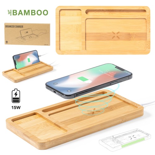 Cargador organizador inalámbrico 15W de línea nature. Con función soporte para smartphone y compartimento extra para objetos. Salida USB de 2.000 mA. Permite cargar de manera simultánea hasta 2 dispositivos (1 mediante carga inalámbrica y 1 mediante cable). Hecho en bambú procedente de cortes naturales y compatible con dispositivos equipados con tecnología de carga inalámbrica. Amplia superficie de marcaje y presentado en caja individual de diseño eco en cartón kraft. Inalámbrico 15W. Salida USB