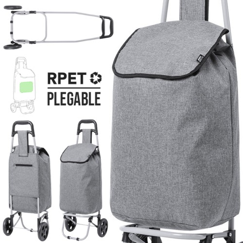 Carro de compra plegable y línea nature. Fabricado en resistente poliéster 600D RPET, elaborado a partir de plástico reciclado, para así fomentar la reutilización de residuos plásticos y ayudar a la sostenibilidad del planeta. Con asa reforzada, cuerpo metálico tubular, bolsillo de cremallera posterior y soportes con gomas de protección. Ruedas reforzadas de alta calidad. Etiqueta distintiva RPET en la solapa. Plegable
