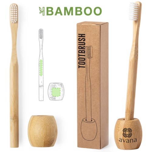 Cepillo de dientes de línea nature. Fabricado en bambú y con soporte en el mismo material. Presentado en caja individual de diseño eco.