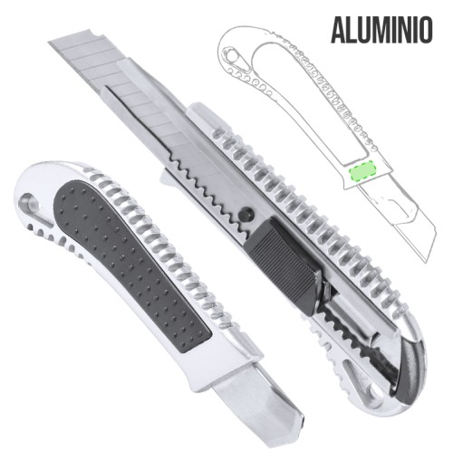Cutter en combinación de materiales acero inox y aluminio con cuchilla ancha y mango ergonómico troquelado. Capucha extraíble para ajuste de corte de cuchilla.