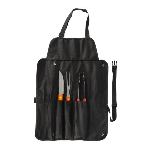 Delantal de tela raquelada negra con 3 prácticas herramientas para asado. Plegable y transformable en bolso. Fácil para bordar o imprimir.