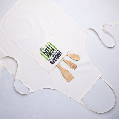 Delantal en material 100% algodón de 140g/m2. En color natural, con amplio bolsillo frontal y cintas de ajuste a juego. De corte por debajo de la rodilla.