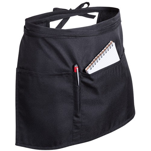 Delantal para cintura en material 100% poliéster de suave acabado en elegante color negro. Con 2 bolsillos grandes, bolsillo mediano y funda par bolígrafo. Ajustable mediante cintas.