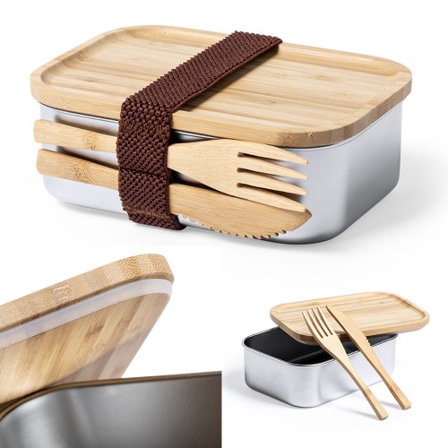 Fiambrera de línea nature. Tapadera y cubiertos fabricados en bambú, con compartimento principal en acero inox de 600 ml de capacidad. Incluye cinta de seguridad con tenedor + cuchillo y tapa hermética con banda de goma. Presentada en atractiva caja individual de diseño nature. 600 ml