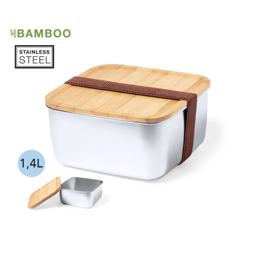 Fiambrera de 1,4 ml de capacidad y diseño cuadrado, fabricada en acero inox. Con tapa hermética en bambú y cinta elástica de cierre. Presentada en caja individual de diseño. 1400 ml