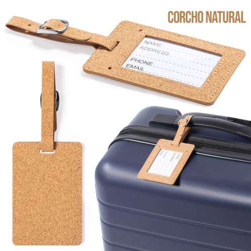 Identificador para maletas de línea nature fabricado en corcho natural. Cinta de acople con cierre de hebilla metálica y tarjeta de identificación en inglés.