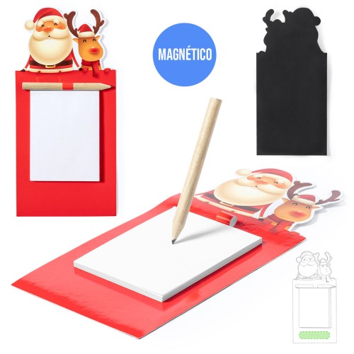 Imán con bloc de notas en divertido diseño navideño de Papá Noel y Reno. Incluye 40 hojas lisas y lápiz de madera natural. Bloc 40 Hojas. Lápiz Incluido