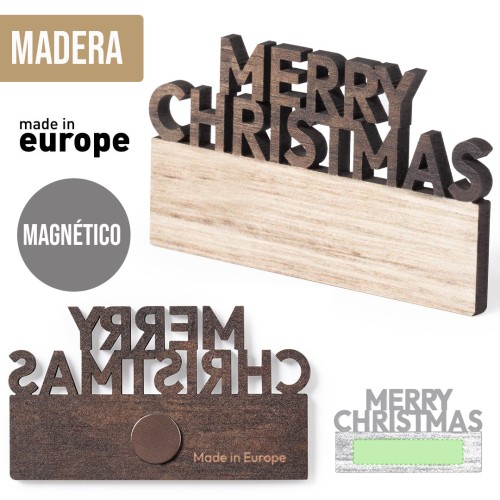 Original imán Merry Christmas fabricado en madera natural, con texto troquelado y de original acabado bicolor. Amplia superficie de marcaje y distintivo Made In Europe.
