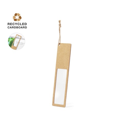 Marcapáginas de línea nature con lupa 3X integrada. Fabricado en cartón reciclado, con amplia superficie de marcaje y con cordón de transporte a juego.