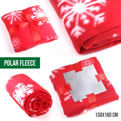 Manta de 130x160cm en original diseño de navidad de color rojo con motivos navideños en blanco. En suave y cálido material polar fleece de 200g/m2 con tratamiento antipilling. Presentada con cartón de color plateado y cinta lazo a juego en suave poliéster. Anti-Pilling