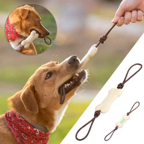 Mordedor para mascotas, con hueso fabricado en resistente material TPR, seguro e inofensivo para la mascota. Cordón en resistente poliéster.
