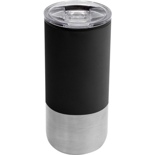 Ø 8 cm X 17.6 cm. Capacidad 500 ml. Polipropileno y acero inoxidable. Mug doble pared. Interior en plástico y exterior de acero inoxidable 201. Tapa plástica transparente a presión con anillo de silicona. Base antideslizante. Presentación en caja de regalo.