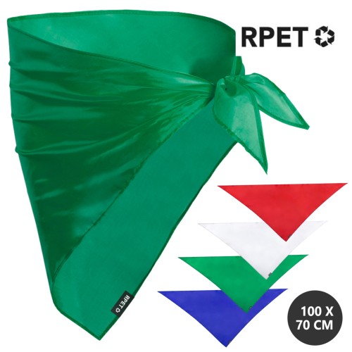 Pañoleta tamaño extra de diseño tirangular fabricada en 190T RPET. Con cuerpo en suave poliéster reciclado de vivos y variados colores. Etiqueta distintiva y pespuntes de refuerzo en los laterales. Color blanco especialmente diseñado para marcaje en sublimación. El material RPET se elabora a partir de plástico reciclado, para así fomentar la reutilización de residuos plásticos y ayudar a la sostenibilidad del planeta.