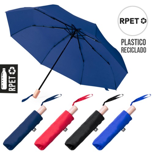 Paraguas plegable de línea nature de 95cm de diámetro. En material pongee 190T RPET, elaborado a partir de plástico reciclado, para así fomentar la reutilización de residuos plásticos y ayudar a la sostenibilidad del planeta. De apertura manual, con sistema anti viento y varillas metálicas. Mango de madera, con funda de transporte y cintas a juego. Con etiqueta distintiva RPET 21"". Sistema Antiviento. Mango Madera. Funda Pongee