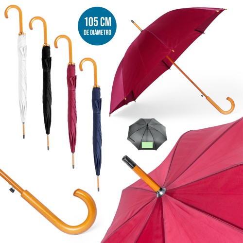 Paraguas de 8 paneles y 105 cm de diámetro, en resistente material poliéster 190T. De apertura automática, con mango curvado y caña, ambos en madera. Varillas metálicas en color negro, tira con cierre de velcro y disponible en variada gama de colores. 23"". Automático. Mango y Caña Madera
