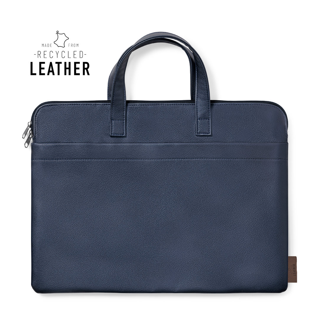 Resistente portadocumentos premium, fabricado en cuero reciclado. Compartimento principal con cierre de cremallera y doble tirador metálico. Interior acolchado, con bolsillo exterior y asas reforzadas a juego. Etiqueta exterior con distintivo cuero reciclado. El cuero reciclado rescata las fibras desechadas en los procesos de fabricación del cuero, minimizando el desperdicio de material, contribuyendo a reducir el impacto ambiental y manteniendo a la vez sus propiedades originales. Acolchado