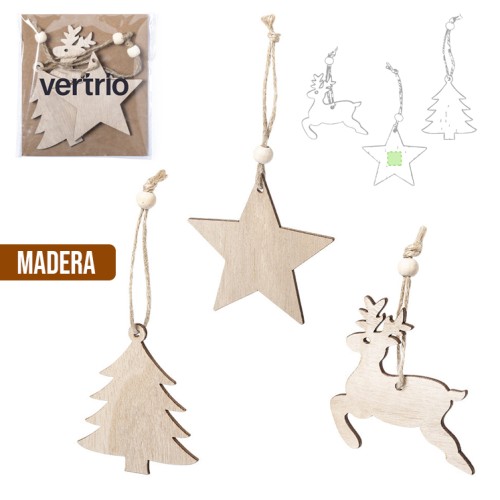 Set de 3 figuras navideñas de línea nature para colgar, fabricadas en madera de tacto suave. Cordón en yute con bolita para ajuste. Incluye reno, estrella y árbol de navidad. Presentado en bolsa individual con cartón interior en color natural. 3 Piezas