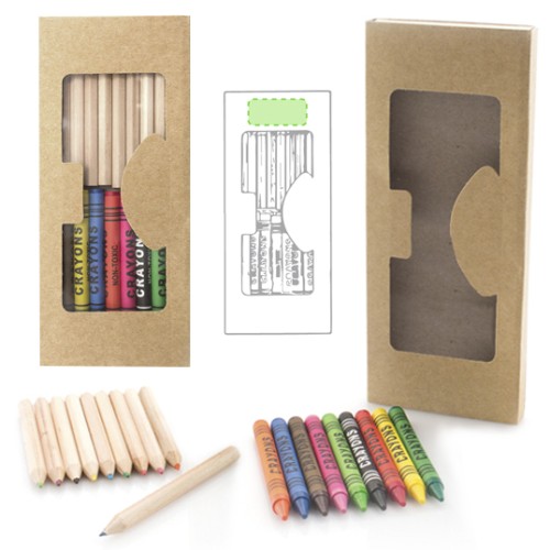 Set de 19 piezas en estuche con cuerpo en cartón natural con ventana y bandeja interior. Contiene ceras de cuerpo cilíndrico y lápices de madera natural de cuerpo hexagonal en variados colores. 19 Piezas