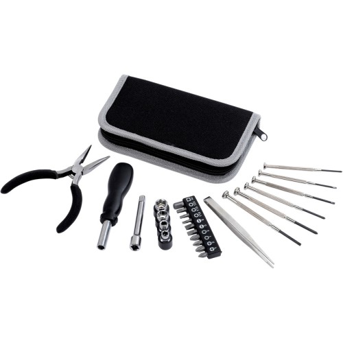 18 x 3,5 x 9,5 cm Set de 24 piezas. Destornilladores, pinzas, complementos. Estuche negro con cierre. Presentación en caja de regalo.