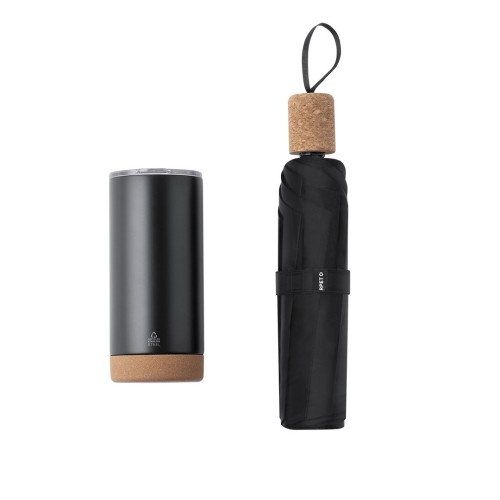 Elegante set premium que incluye: Vaso térmico de doble pared en Acero Inox Reciclado y 550 ml de capacidad, con elegante acabado negro mate. Base de corcho, con tapadera a presión y dosificador. Paraguas plegable de color negro con 98cm de diámetro. En material pongee 190T RPET y mango de corcho. De apertura manual, con sistema anti viento y varillas en fibra de vidrio. Con etiqueta distintiva RPET. Set presentado en estuche individual de acabado mate, con troquelado interior para cada uno de los elementos del set. El material RPET se elabora a partir de plástico reciclado, para así fomentar la reutilización de residuos plásticos y ayudar a la sostenibilidad del planeta. Vaso Térmico Acero Inox Reciclado/ Corcho. 550 ml