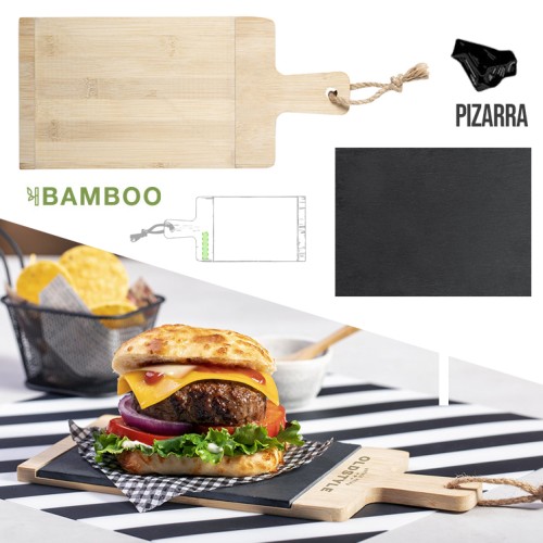 Tabla fabricada en combinación de materiales bambú y pizarra, de suave y resistente acabado pulido. Ideal para corte y presentación. Con asa para fácil manejo y cordón para colgar. Tabla de pizarra extraíble para fácil limpieza. Presentada en atractiva caja individual de diseño eco.