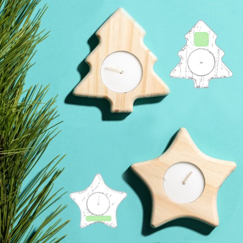 Vela de navidad de madera de pino con originales diseños de estrella y arbolito. Presentada en cajita blanca individual.