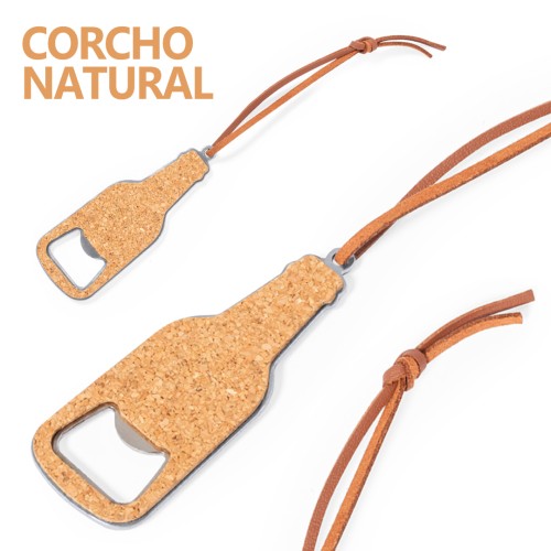 Abridor de botellas fabricado en corcho, adoptando la forma de un botellín. Su diseño incluye un cordón práctico que facilita su transporte y la opción de colgarlo cómodamente. Presentado individualmente en bolsa de papel reciclado. Elaborado con elementos vegetales para así fomentar la utilización de materias primas naturales y reducir las emisiones contaminantes.