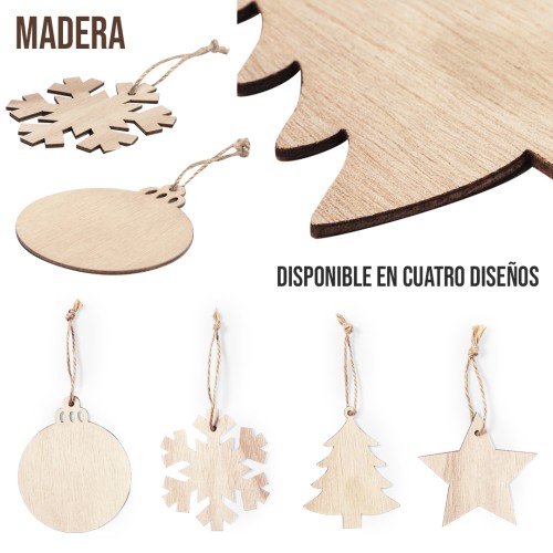 Elegante y moderno adorno navideño en suave madera natural. Incluye accesorio para colgar en yute natural y está disponible en cuatro diseños: Copo de Nieve, Bolsa de Navidad, Árbol y Estrella. Presentado en bolsa individual reciclada.Elaborado con elementos vegetales para así fomentar la utilización de materias primas naturales y reducir las emisiones contaminantes.