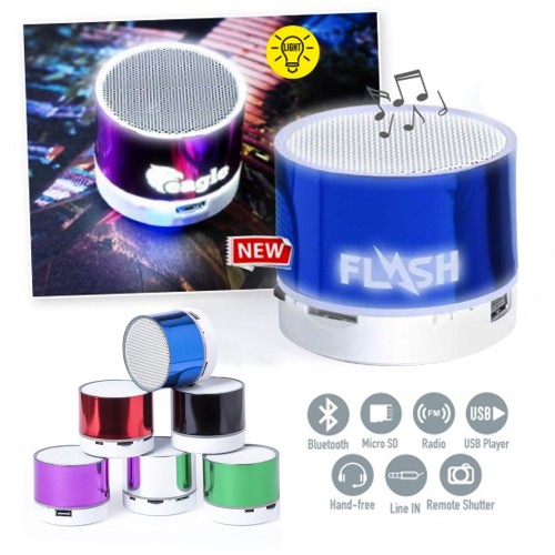 Compacto altavoz de conexión Bluetooth® con interior iluminado. Superficie exterior especialmente diseñada para marcaje en láser y así iluminar el logotipo marcado. De diseño bicolor con suave acabado y conexión Bluetooth® 3.0, ofrece 3W de potencia, tiene función de manos libres, una ranura para tarjetas micro SD de hasta 32 GB de capacidad, función radio FM, entrada auxiliar de línea mediante conexión jack de 3,5mm y soportes de goma antideslizantes en la base. Compatible con iOS y Android, incluye cable de carga mini USB, cable auxiliar jack de 3,5mm y viene presentado en atractiva caja de diseño. Con base antideslizante. Luces Led. Conexión Bluetooth. Potencia Sonido 3W. Batería 300 mAh