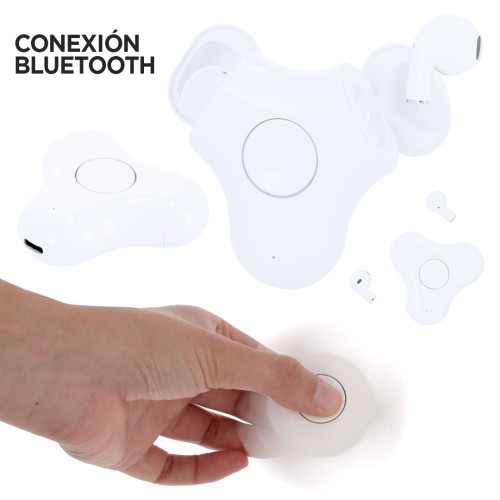 Auriculares intraurales en elegante acabado blanco y conexión Bluetooth 5.3. Estuche con original diseño en forma de spinner, con batería de 200 mAh. Auriculares botón de control táctil integrado y con función manos libres. Recargables, con cable Tipo C -incluido-. Disponible manual de instrucciones en español e inglés. Conexión Bluetooth. Batería 30 mAh/ Base Carga 200 mAh