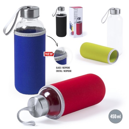 Bidón de cristal de 420ml de capacidad con funda de neopreno en vivos colores. Con tapón de seguridad a rosca y cinta de transporte. 420 ml. Funda Soft Shell
