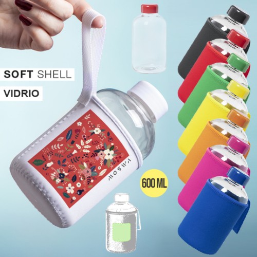 Bidón de 600ml de capacidad. Fabricado con cuerpo de cristal y tapón a rosca. Incluye funda de soft shell a juego, con asa de transporte. Disponible en variada gama de colores, y viene presentado en caja individual de atractivo diseño. 600 ml. Funda Soft Shell