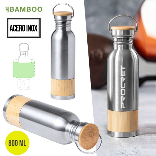 Bidón de original estilo retro y 800 ml de capacidad. Cuerpo en acero inox con franja de bambú, con tapón de seguridad a rosca en acero inox y detalle en bambú. Presentado en caja individual de diseño eco en cartón kraft. 800 ml
