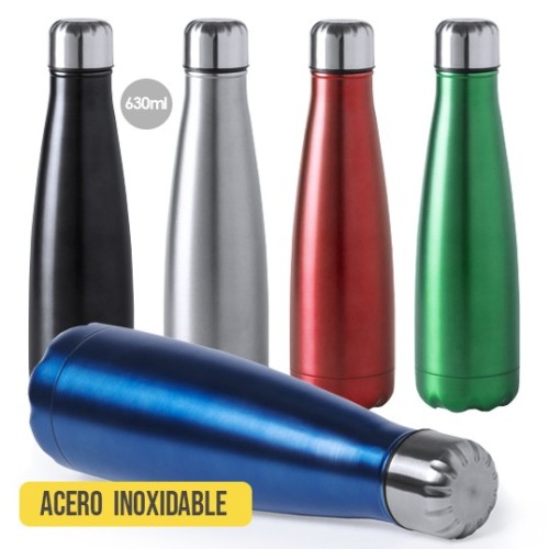 Bidón fabricado en acero inox de 630ml, con tapón de seguridad a rosca. Acabado mate en vivos y variados colores; presentado en caja individual. 630 ml