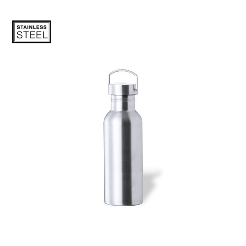 Bidón de 750 ml de capacidad, fabricado en acero inox de acabado brillo. Con original tapón a rosca en acero inox, a juego y con asa integrada. Libre de BPA y presentado en caja individual de diseño kraft. 750 ml