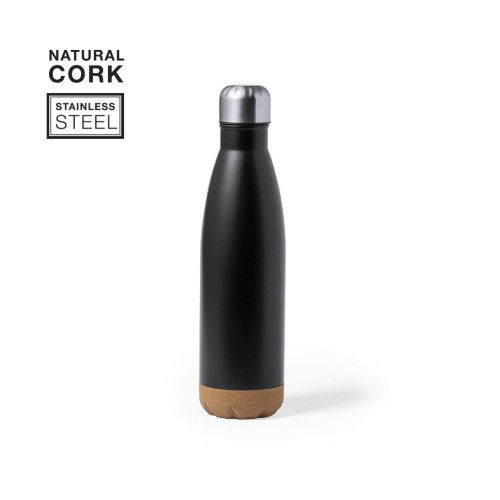 Bidón de 750 ml de capacidad, fabricado en acero inox. Con base en corcho natural y tapón a rosca, libre de BPA. Disponible en variada gama de colores satinados y presentado en caja individual de diseño kraft. 750 ml