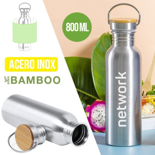 Bidón de línea nature y 800ml de capacidad. Cuerpo fabricado en acero inox y tapón en bambú con original asa metálica de transporte. Presentado en atractiva caja de diseño eco. 800 ml