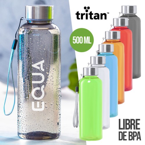 Bidón de 500ml de capacidad. Libre de BPA, con cuerpo fabricado en tritán transparente y de alta resistencia al calor. Tapón a rosca en acero inox, con cordón de transporte. Disponible en variada gama de colores. 500 ml