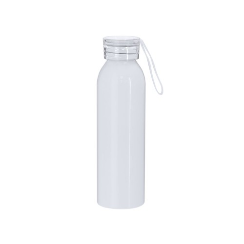 Bidón de 650 ml de capacidad fabricado en resistente aluminio. En color blanco brillante, especialmente diseñado para la sublimación. Con tapón a rosca translúcido y correa a juego para un sencillo transporte. Libre de BPA. 650 ml